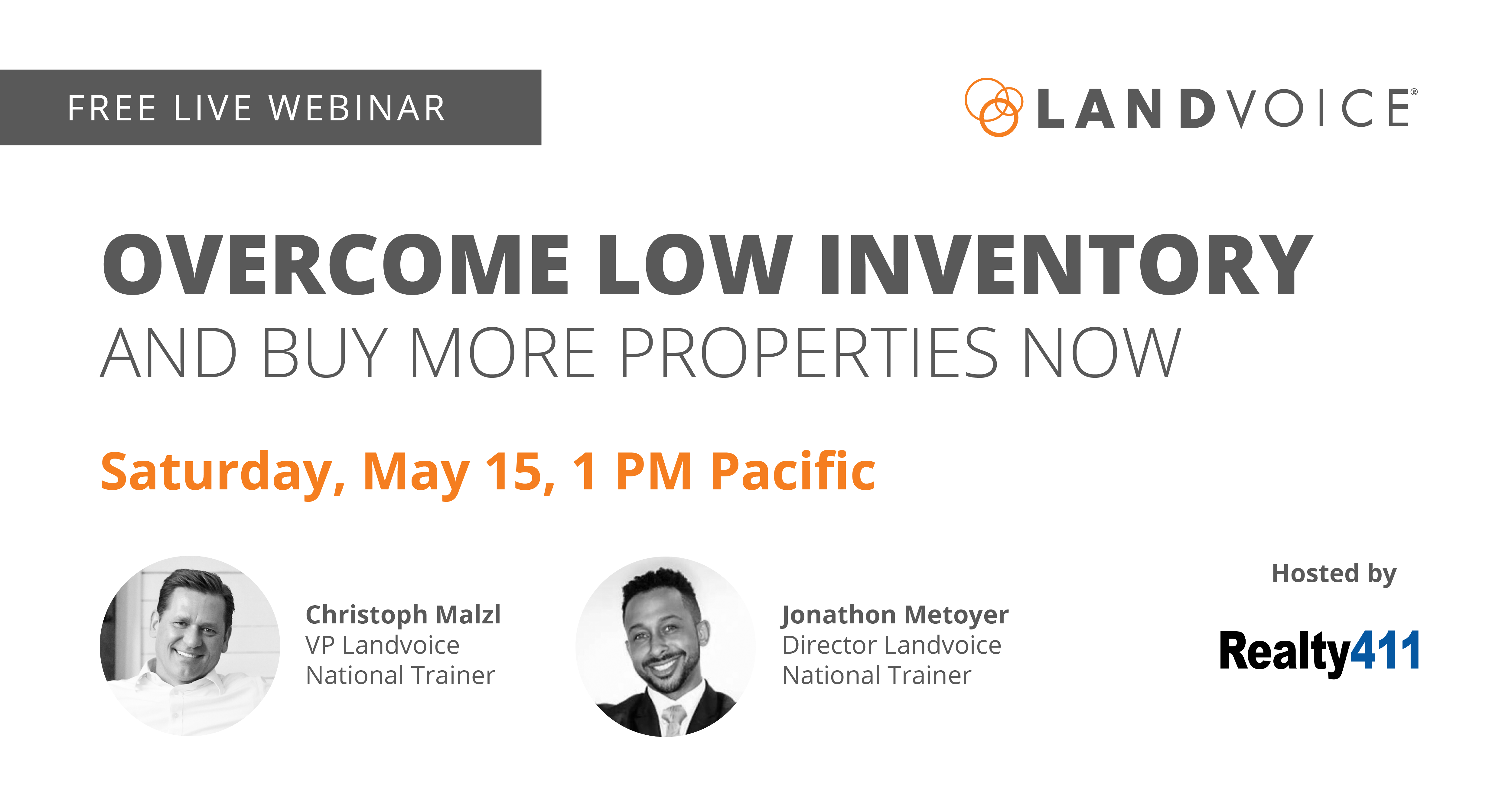 We’ve partnered with Landvoice to provide you with a FREE TRAINING on May 15th at 1:00 PM. This is a virtual discussion on How to Overcome Low Inventory and Buy More Properties Now.
