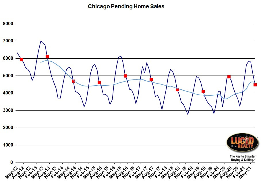 Chicago home sale contract activity has pulled back a bit from the pandemic highs but it's still higher than all the other years.